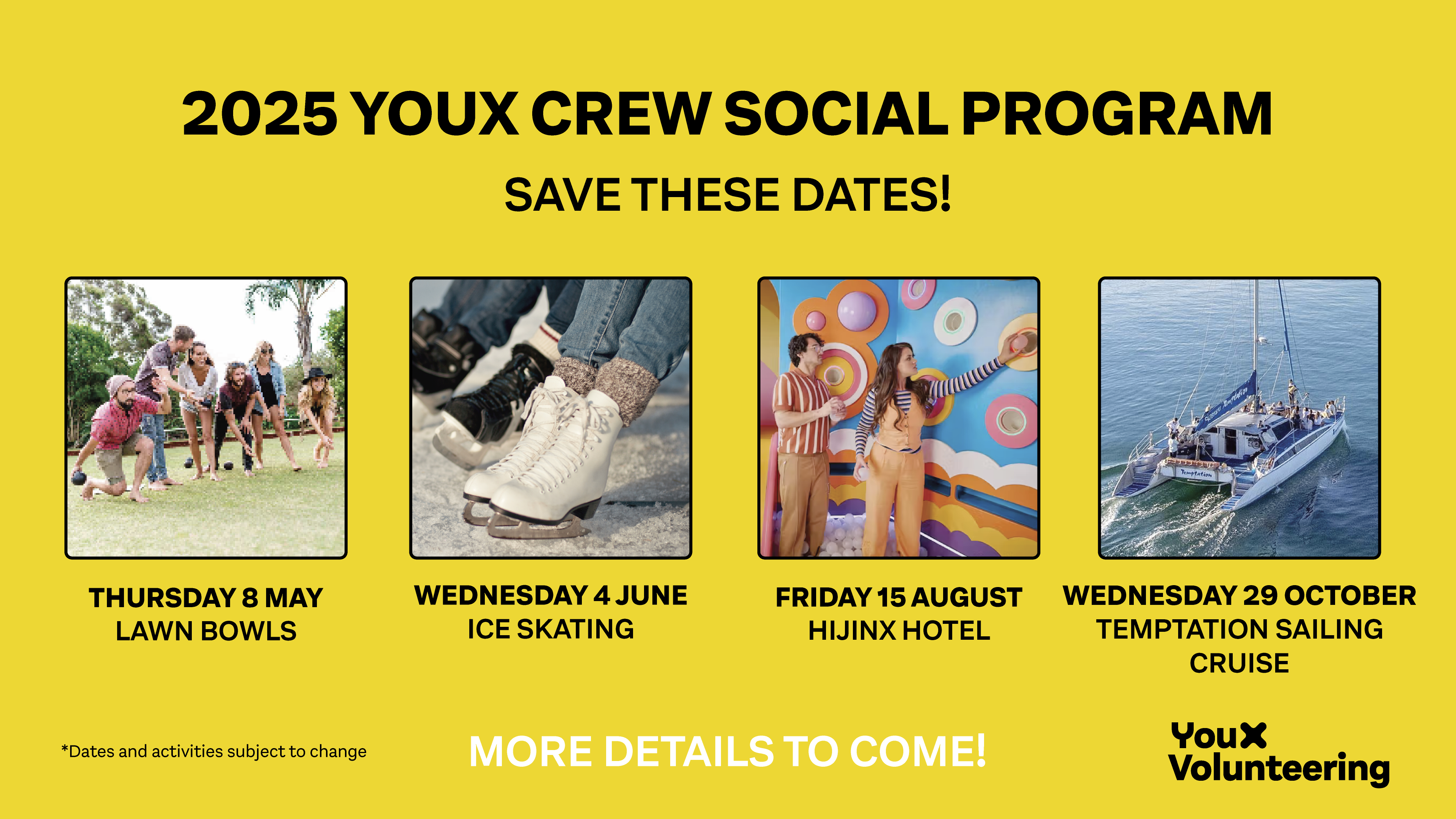 *Dates and times subject to change. Social events are only available to volunteers who have completed at least one YouX Crew shift, excluding inductions, and past social events.
